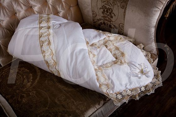 Конверт на выписку с кружевной отделкой, состав – сатин (100% хлопок), наполнитель – синтепон. (Плотность - 400гр.)