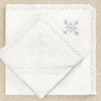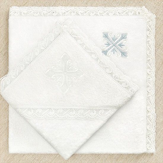 Мягкое пушистое махровое полотенце - крыжма - белого цвета с кружевом по краям и вышитым крестиком в одном из уголков в бело-голубом цвете.