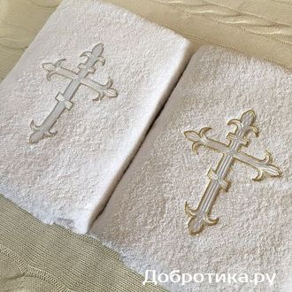 Украшено вышитым восьмиконечным крестиком - золотым или серебряным - на Ваш выбор!
