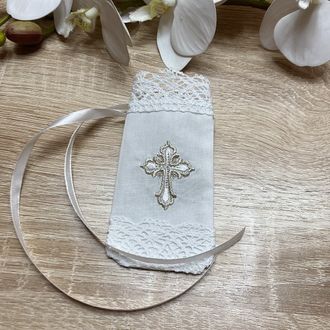По одному краю мешочка расположено кружево. В центре вышит золотой или серебряный крест со стразами. Закрывается на завязочки, ленточки.