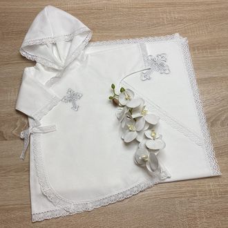 2. Большая пеленка из сатина или фланели 100х100см с вышитым крестиком на капюшоне или в уголке (если выбрана пеленка без капюшона) и кружевом по всем сторонам