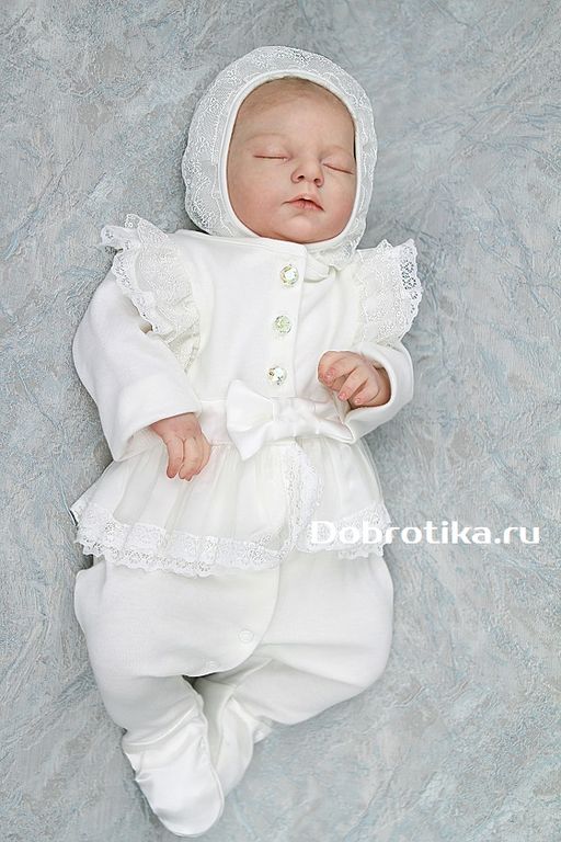 Трикотажный набор на выписку девочки с декоративной юбочкой, кружевными крылышками и шелковым бантиком на поясе. Чепчик также украшен кружевной рюшью.
