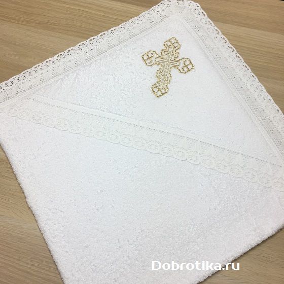 Большое крестильное полотенце (крыжма) из мягкой махры с широким хлопковым кружевом по краям и вышитым крестиком на капюшоне