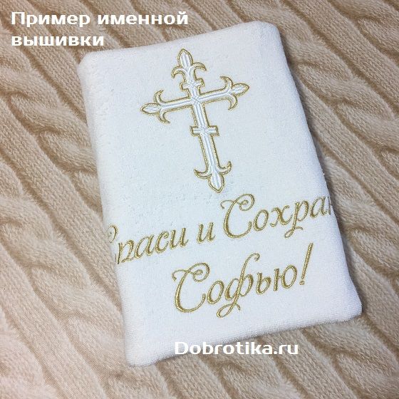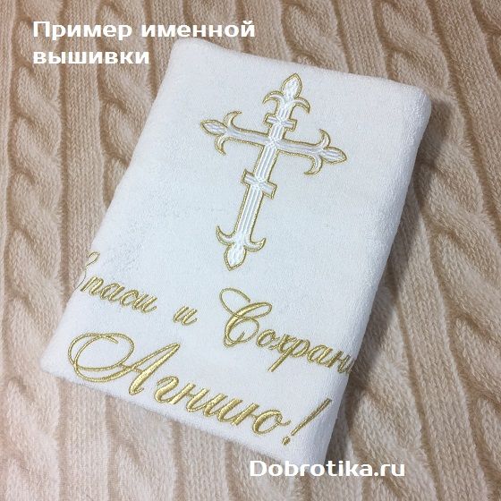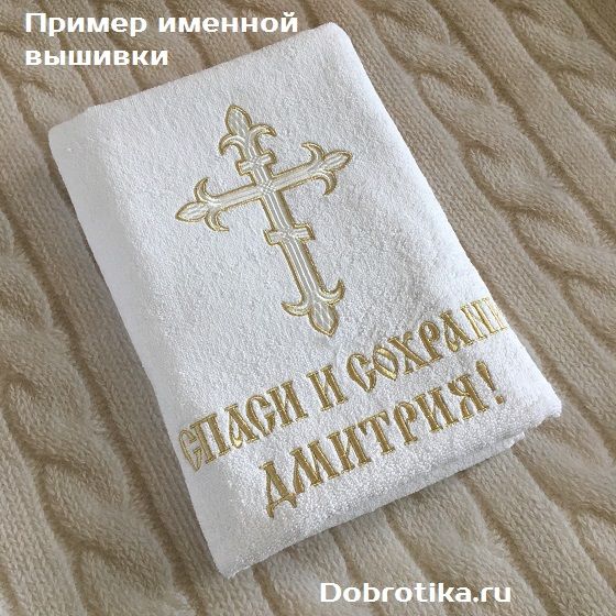 Украшено вышитым восьмиконечным крестиком и именной надписью.