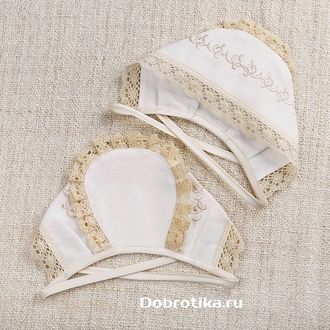 Чепчик для девочки из белоснежной мягкой фланели с благородной бежевой отделкой