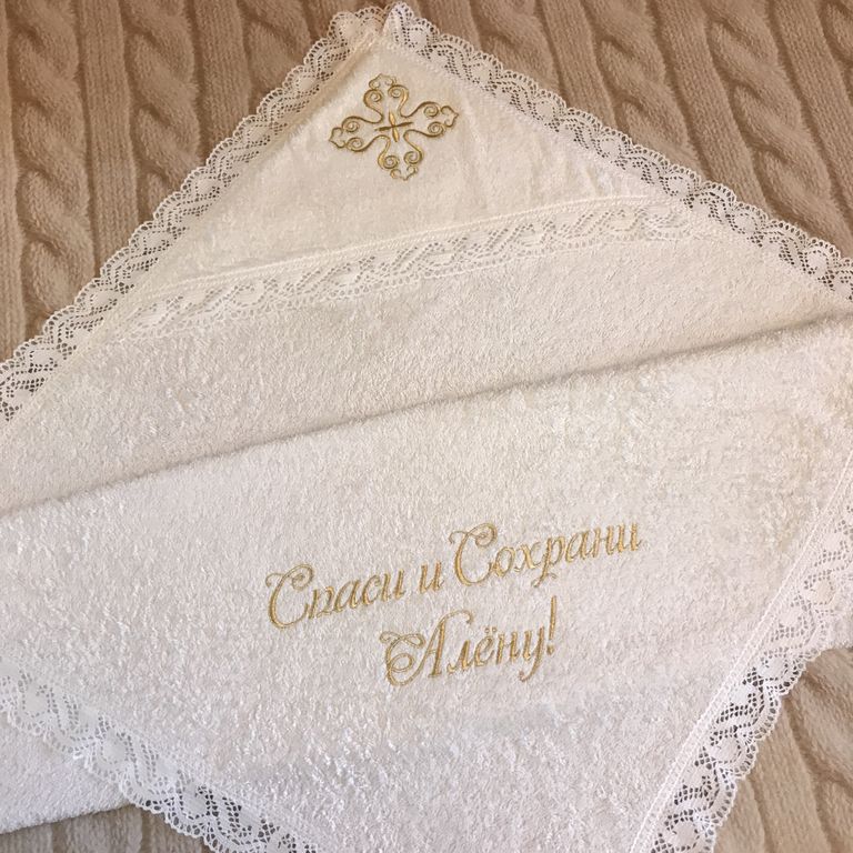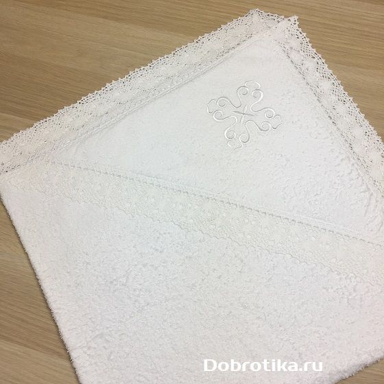 Большое крестильное полотенце (крыжма) из мягкой махры с широким хлопковым кружевом по краям и вышитым крестиком