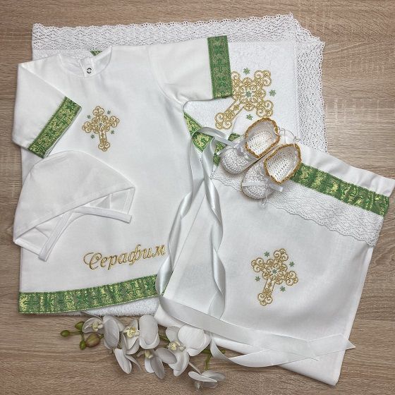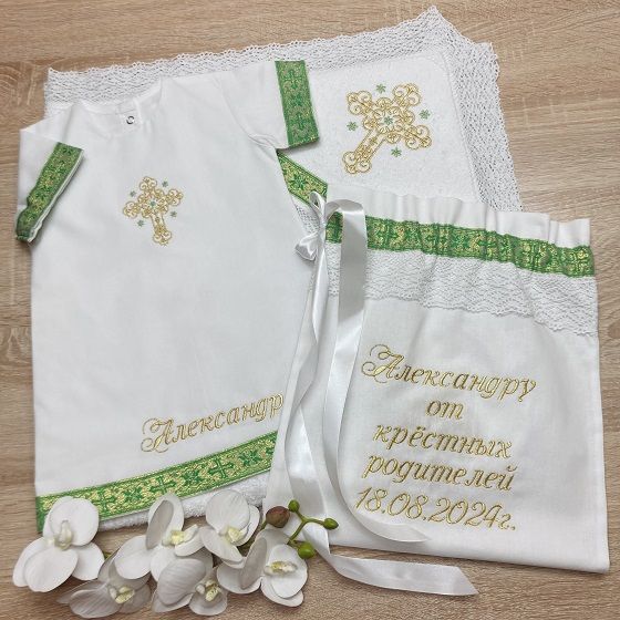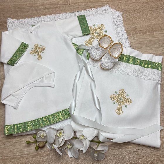 1. Рубашка из 100% хлопка (сатин или фланель) сзади на кнопочках, с вышитым крестиком (вышивка закрыта подкладкой) и золотисто-зеленой тесьмой