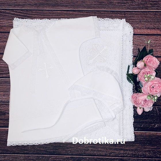 1. Длинная крестильная рубашечка, украшенная тремя видами кружев и вышитым крестиком