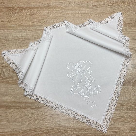 Отделка: хлопковое кружево по всем сторонам, вышивка (цветок лилии)