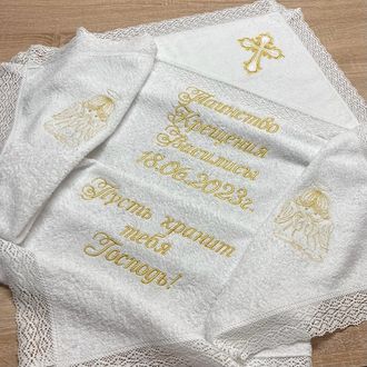 Большое крестильное полотенце с ангелом (крыжма) 100х100 см из мягкой махровой ткани с широким хлопковым кружевом по краям и вышитым крестиком