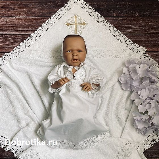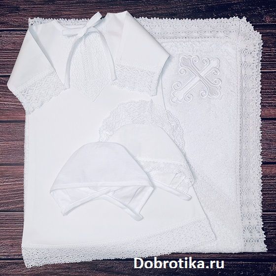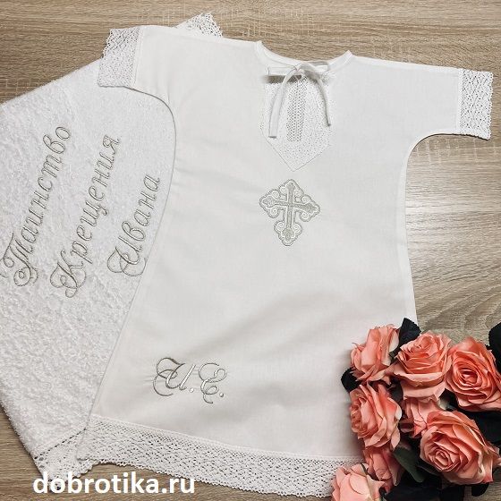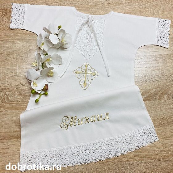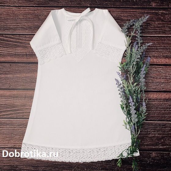 Изюминка - широкое хлопковое кружево на планке, рукавах и по низу рубашки. Можно дополнить вышитым крестиком - спереди или на спинке, форма и цвет креста - на выбор.