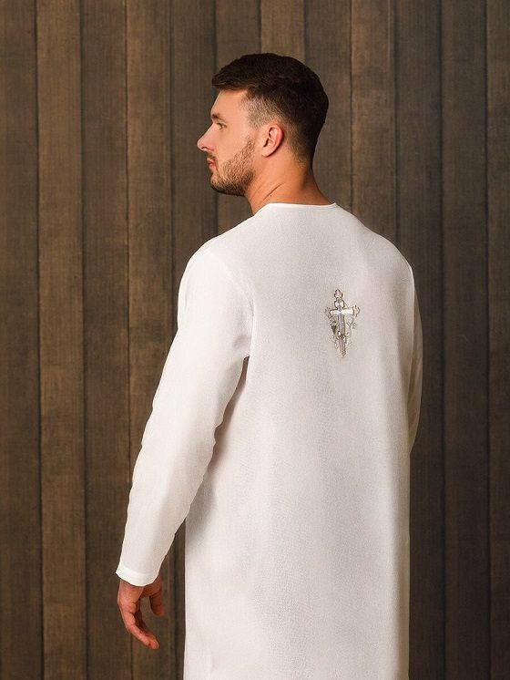 - на спинке рубашки вышит крестик