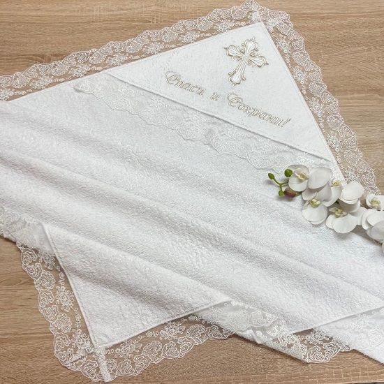 Большое крестильное полотенце (крыжма) 100х100 см из мягкой махровой ткани с широким кружевом по краям, вышитым крестиком и молитвой "Спасии и Сохрани!"