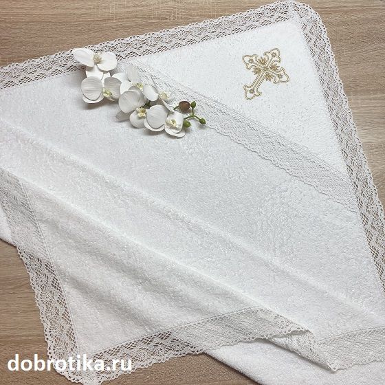 Большое крестильное полотенце (крыжма) из мягкой махры с широким хлопковым кружевом по краям и вышитым крестиком