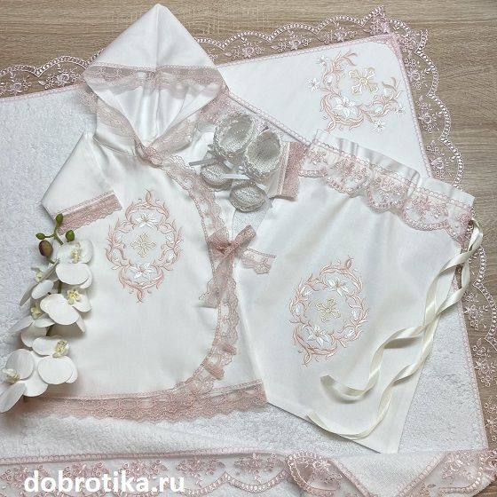 1. Платье с капюшоном распашное спереди, отороченное нежно-розовым кружевом с объёмной вышивкой лилейного орнамента, обрамляющего крестик