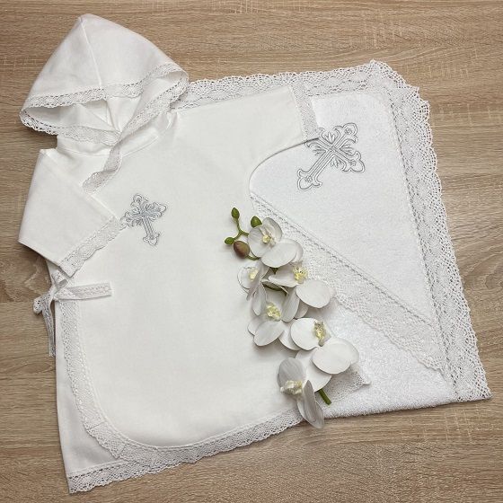 1. Длинное распашное спереди платье для Крещения из 100% хлопкас капюшоном и вышитым крестиком