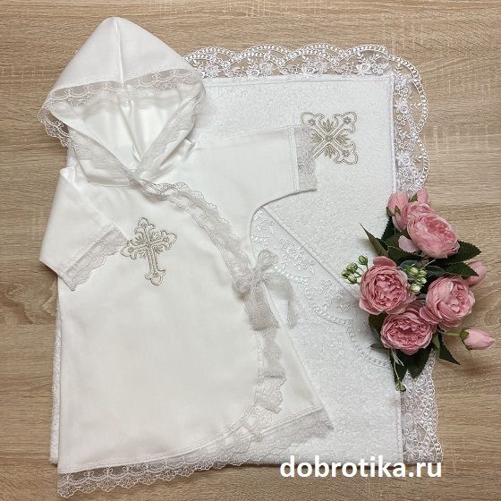 1. Длинное платье-рубашка для Крещения из 100% хлопкового сатина или теплой фланели с капюшоном и вышитым крестиком