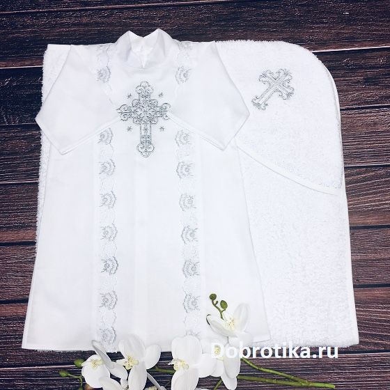 Крестильный комплект для мальчика, модель "Георгий", цвет вышивки и кружева - серебро: