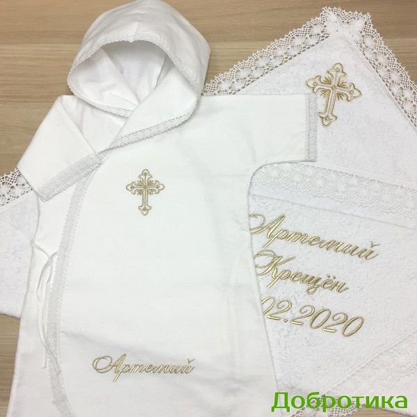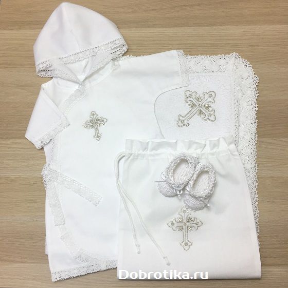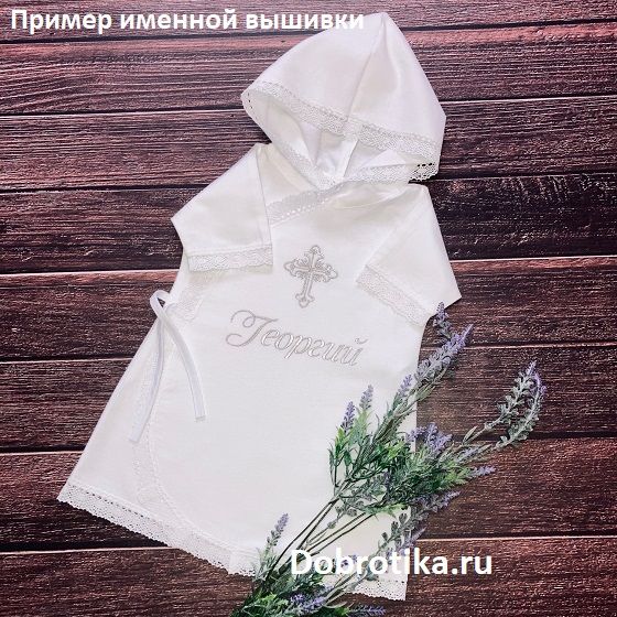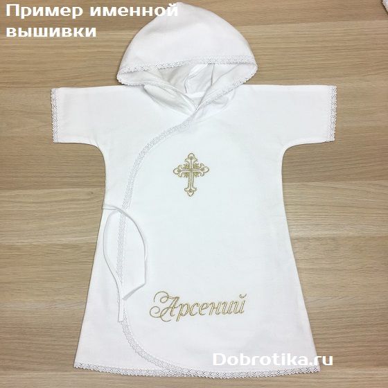 1. Длинная распашная рубашка для Крещения из 100% хлопка - сатина или фланели с капюшоном, вышитым крестиком и кружевной отделкой