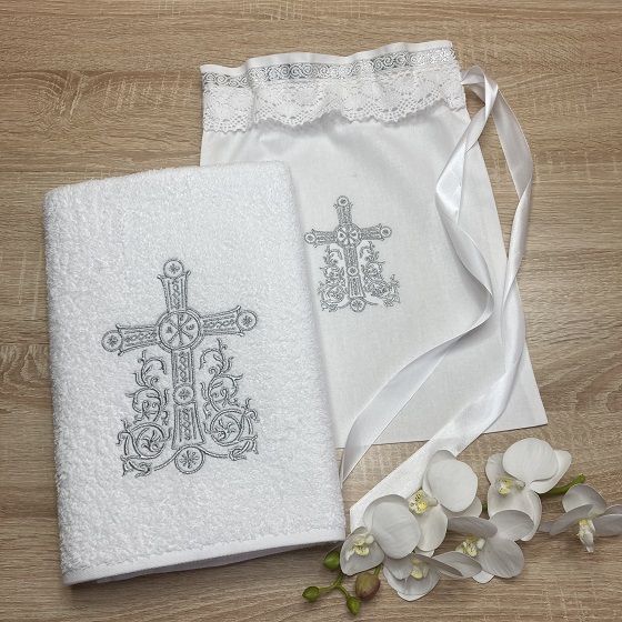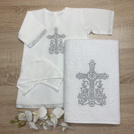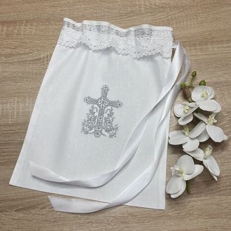 Отделка: объемный вышитый крестик (серебряная металлизированная нить), хлопковое широкое кружево, серебристая тесьма