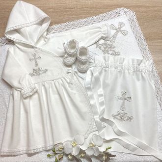 1. Платье из фланели с длинным рукавом и капюшоном, вышитым крестиком с виноградной гроздью и кружевной отделкой по всем краям