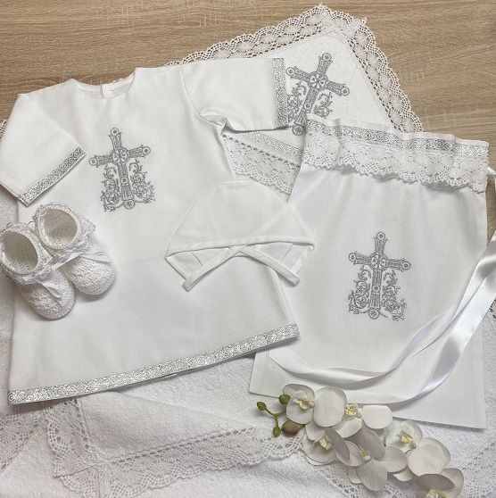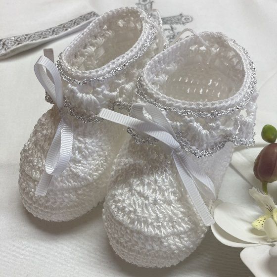 Беленькие нарядные пинетки с ажурным верхом и серебряной обвязкой