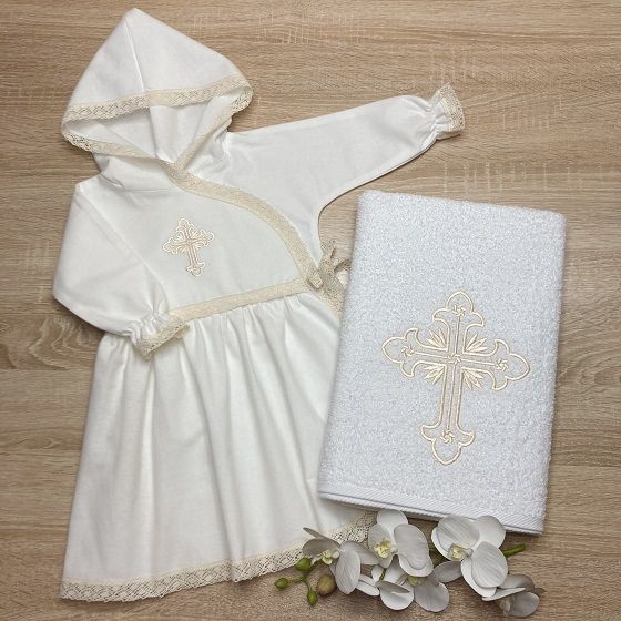 Красивый крестильный набор для девочки из нежнейшией фланели белого цвета в сочетании с бежевым плетеным кружевом, золотым или бежевым крестиком.