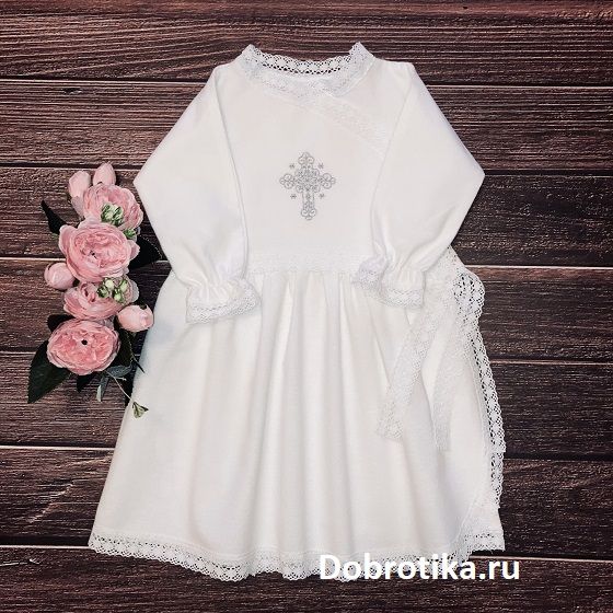 1. Длинное распашное спереди платье для Крещения из 100% хлопковой фланели с вышитым крестиком и кружевом