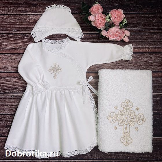 1. Длинное распашное спереди платье для Крещения из 100% хлопковой фланели-люкс с вышитым крестиком и кружевом